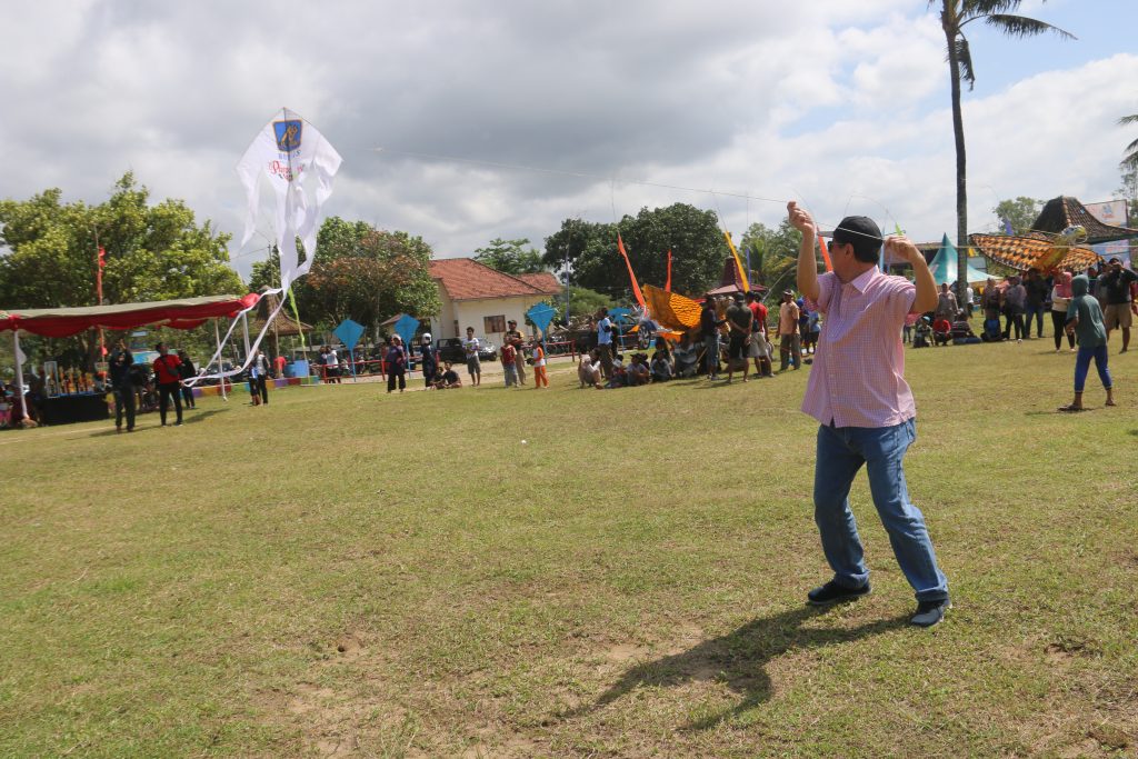 CEO EL JOHN Indonesia Martinus Johnnie Sugiarto yang meninjau jalannya festival, ikut mencoba menaikan layangan yang dibuat oleh pihak panitia.