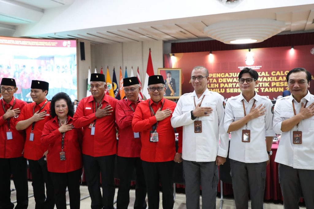Dewan Pimpinan Pusat PDI Perjuangan (PDIP) secara resmi menyerahkan daftar bakal calon legislatif (bacaleg) ke Komisi Pemilihan Umum (KPU) RI, Kamis (11/5/2023). Dalam proses ini Sekretaris Jenderal DPP PDIP Hasto Kristiyanto menitipkan salam dari Ketua Umum DPP PDIP Megawati Soekarnoputri.