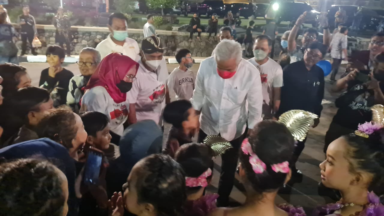 Gubernur Jawa Tengah Ganjar Pranowo dicegat puluhan anak-anak saat menghadiri Gelar Tari Pancasila di komplek Taman Budaya Jawa Tengah (TBJT), Sabtu (25/06/2022). Baru keluar dari mobil, orang nomor satu di Jawa Tengah itu pun langsung kerumuni anak-anak.