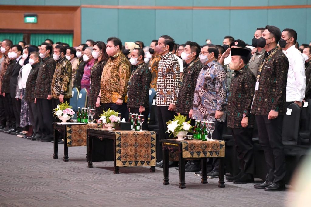 Presiden RI Joko Widodo (Jokowi) menghadiri Perayaan 50 Tahun Himpunan Pengusaha Muda Indonesia (HIPMI) Tahun 2022, yang digelar di Plenary Hall, Jakarta Convention Center (JCC), Jakarta, Jumat (10/06/2022). Pada kesempatan tersebut, Presiden berharap agar pengusaha muda yang tergabung dalam HIPMI dapat bekerja keras menghadapi tantangan-tantangan untuk membangun Indonesia.