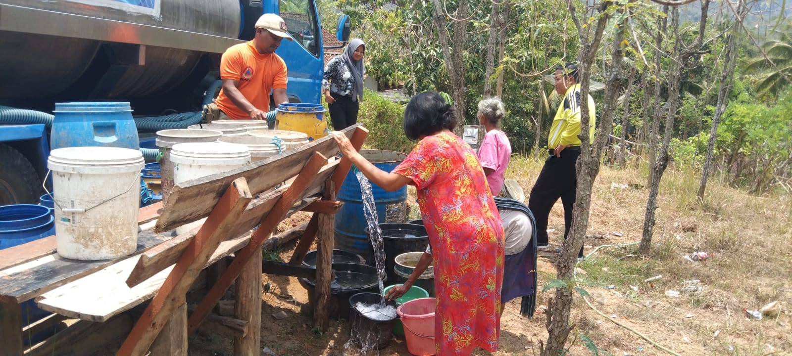 “Di situ ada jerigen ada drum air itu sudah disediakan oleh masyarakat semuanya itu bebas.Jadi setiap pengiriman kita melintas ada yang perlu diisi ya kita isi ke drum. Jadi bukannya warga yang datang tapi kita yang mendatangi warga,” tutur Suyitno