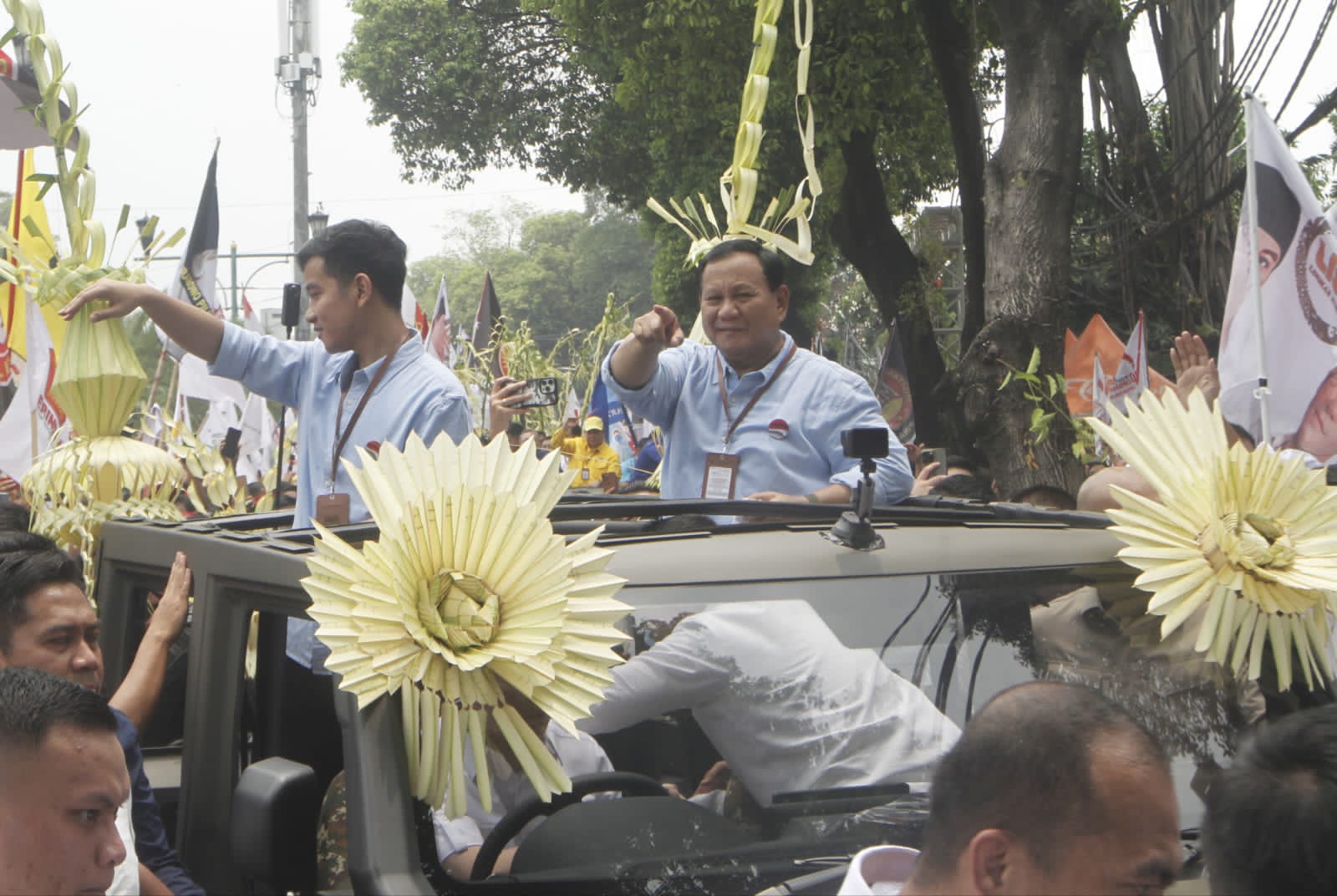 Tiba di kantor KPU sekitar pukul 11.20 WIB, Prabowo dan Gibran kembali menyapa ribuan pendukung dan relawan yang telah menunggu sejak pagi hari di kantor KPU.