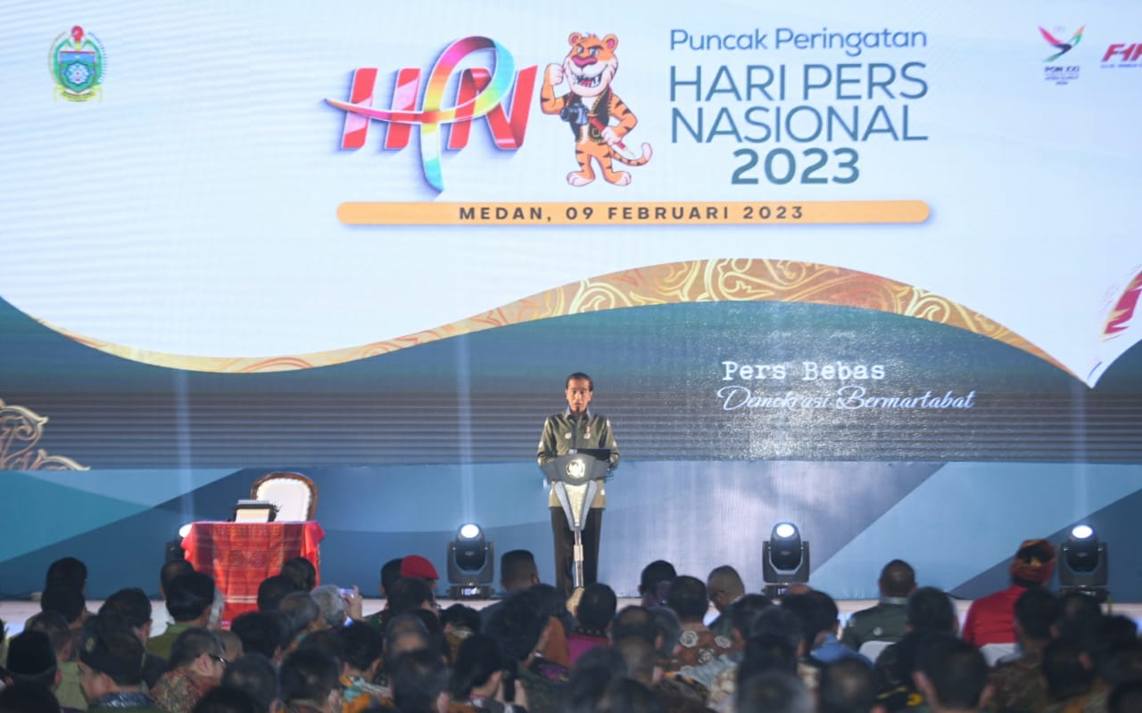Presiden RI Joko Widodo (Jokowi) menghadiri Puncak Peringatan Hari Pers Nasional (HPN) Tahun 2023 yang digelar di Gedung Serbaguna Pemerintah Provinsi Sumatra Utara, Kabupaten Deli Serdang, Kamis (09/02/2023).