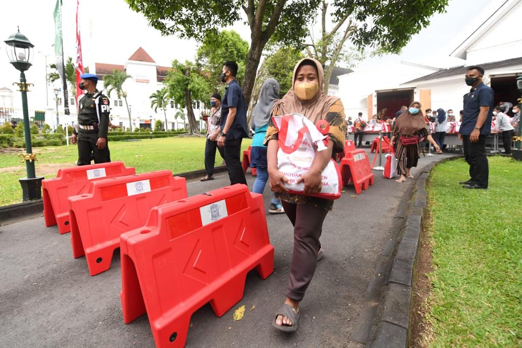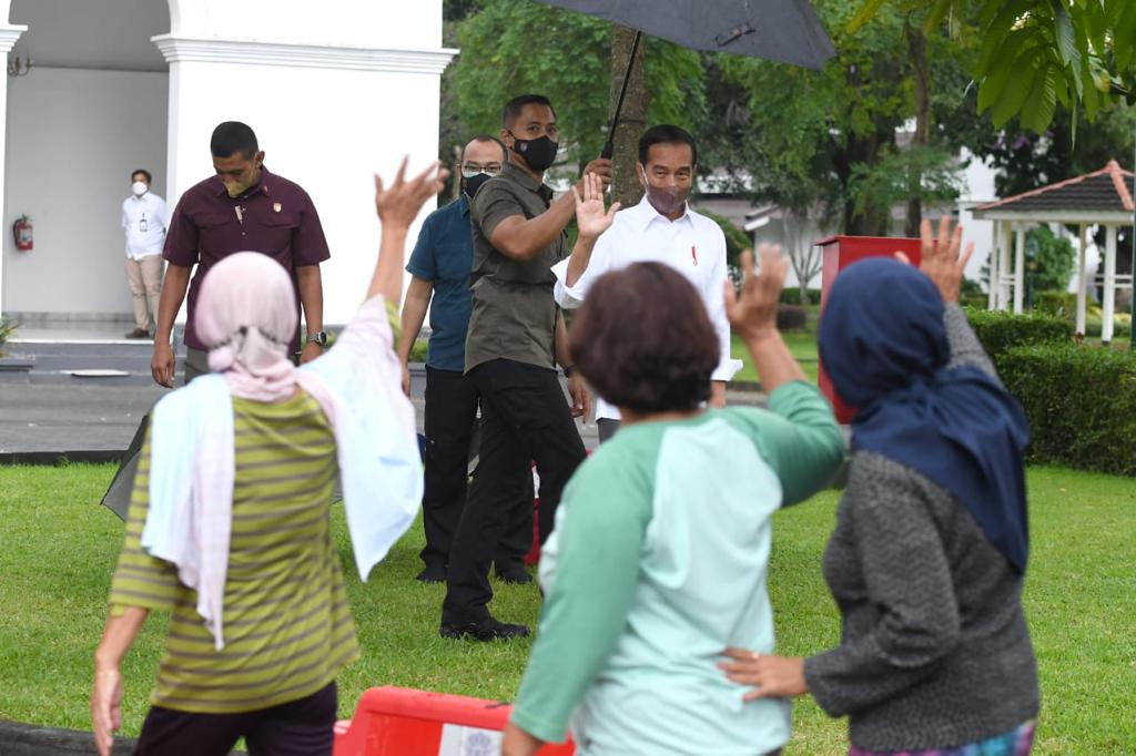Ratusan masyarakat tampak antusias mengantre untuk melihat langsung Kepala Negara dan mendapatkan sembako. Salah satunya Minten, warga Yogyakarta, yang baru pertama kali melihat langsung Presiden Jokowi.