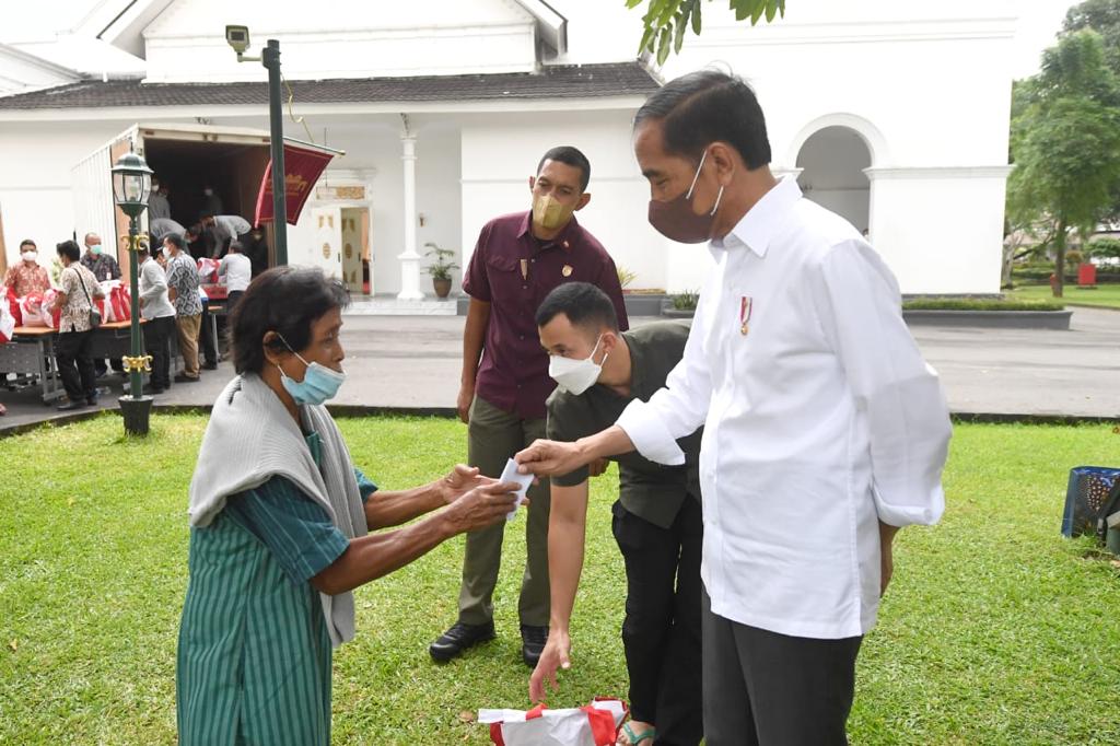 Presiden RI Joko Widodo (Jokowi) membagikan paket sembako bagi masyarakat di sekitar Gedung Agung, Istana Kepresidenan Yogyakarta, Sabtu (30/04/2022). Sekitar pukul 15.00 WIB, Presiden mulai membagikan sembako di gerbang timur Istana.