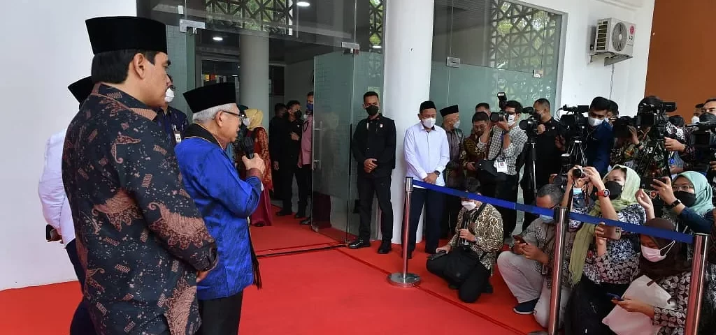 Mendampingi Wapres pada keterangan pers kali ini, Rektor UIN Ar-Raniry Banda Aceh Mujiburrahman, Plt. Direktur Eksekutif Komite Nasional Ekonomi dan Keuangan Syariah (KNEKS) Taufik Hidayat, dan Staf Khusus Wapres Bidang Komunikasi dan Informasi Masduki Baidlowi. (Sumber BPMI Setwapres)